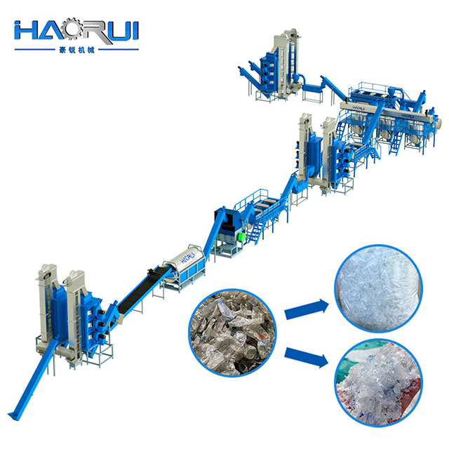 The PET bottle washing recycling line is composed of a series of interconnected machine and equipment,including a de-baler,conveyor,plastic crusher machine,label remover machine,high speed friction washer,sink-floating tank,dewatering/drying units,and an intelligent control system to separate,wash,clean,and crushing PET flakes from waste bottles and sheets.