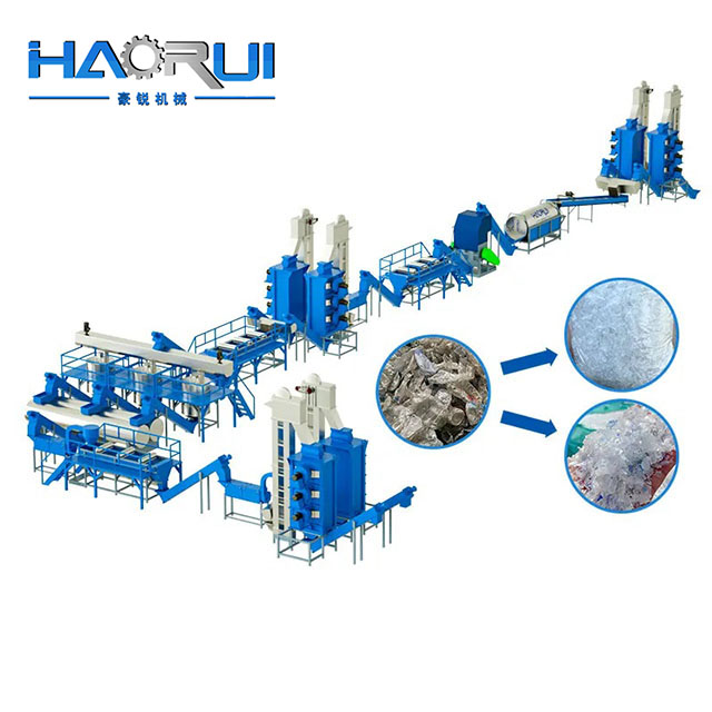 The PET bottle washing recycling line configures 4-5 floating tank and 2-3 high speed friction washing machine,make sure the PET flakes clean , up to B2B grade.2-3 zigzag separator for separating the pvc and labels, the pvc ratio of PET flakes less than 30ppm.