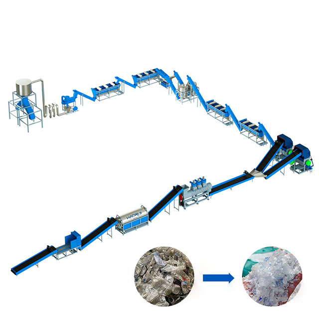 Kita Jalur daur ulang pencucian botol PET menggunakan serangkaian perlengkapan yang saling berhubungan seperti pembuka bale, konveyor penyortiran, layar trommel, mesin penghapus label, mesin penghancur plastik, pemuat sekrup, tangki flotasi panas/dingin, mesin cuci gesekan, mesin dewatering, pemisah zig-zag, dan silo.