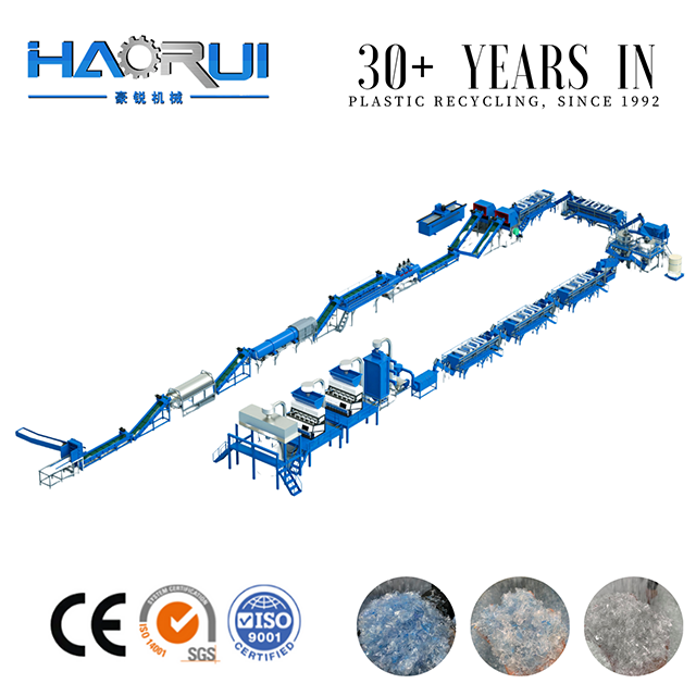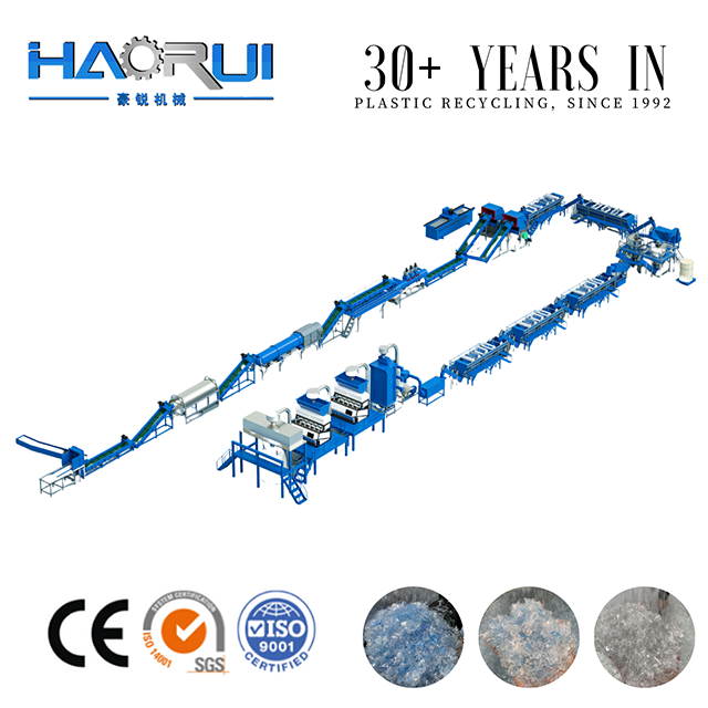 Линија за рециклажу за прање ПЕТ флаша се користи за прераду и рециклажу ПЕТ боца у ПЕТ пахуљице. Процес прања и дробљења се састоји од различитих функционалних јединица укључујући де-балирање, отклањање етикета, одвајање етикета, претпрање боца, ручно сортирање и детекцију метала, мокро млевење, гравитационо одвајање, хемијско прање, паковање за ПЕТ. Коначни резултат који су направили ови Машине за рециклажу ПЕТ боца су рПЕТ пахуљице које не само да имају стабилан квалитет и различите примене, посебно за ПСФ, ПОИ произвођача са великим капацитетом, већ се такође могу постићи примена од флаше до боце уз одобрење ФДА (може директно контактирати храну). Капацитет машине се креће од 500 кг/х до 9000 кг/х, такође можемо да прилагодимо захтевима корисника.