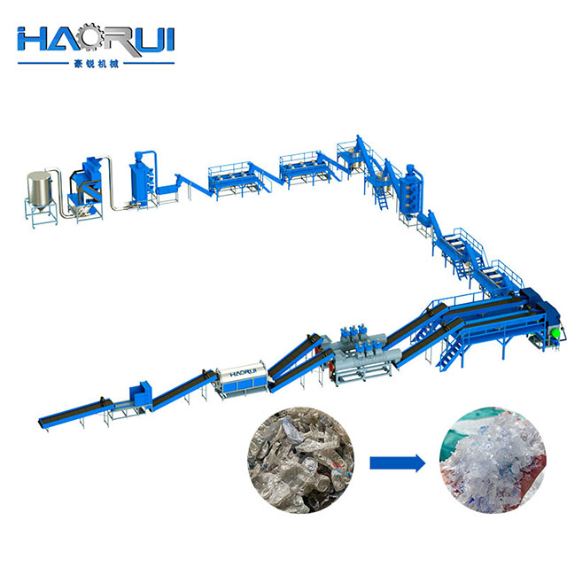 Линија за рециклажу ПЕТ боца користи серију међусобно повезаних машина и опреме, укључујући машину за дробљење пластике на нивоу листова за смањење величине, машину за прање велике брзине трења и врућу машину за прање за уклањање загађивача, систем плутајућих резервоара за одвајање ПЕТ-а од других материјала, машину за одводњавање, разне транспортере, машине за уклањање отворене пластике, машине за уклањање балона, сепаратор и силос за складиштење су такође укључени.